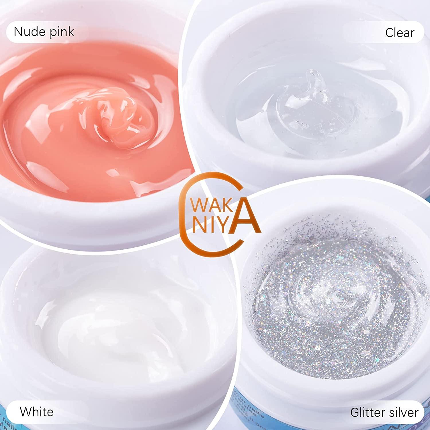 Wakaniya Builder Gel Nail Kit 4 Colors Uv Gel Builder For Nail Extension Clear White Glitter Silver Hard Gel Set With Gel Nail Forms Brush For Beginners Diy Nail Art Supplies 4